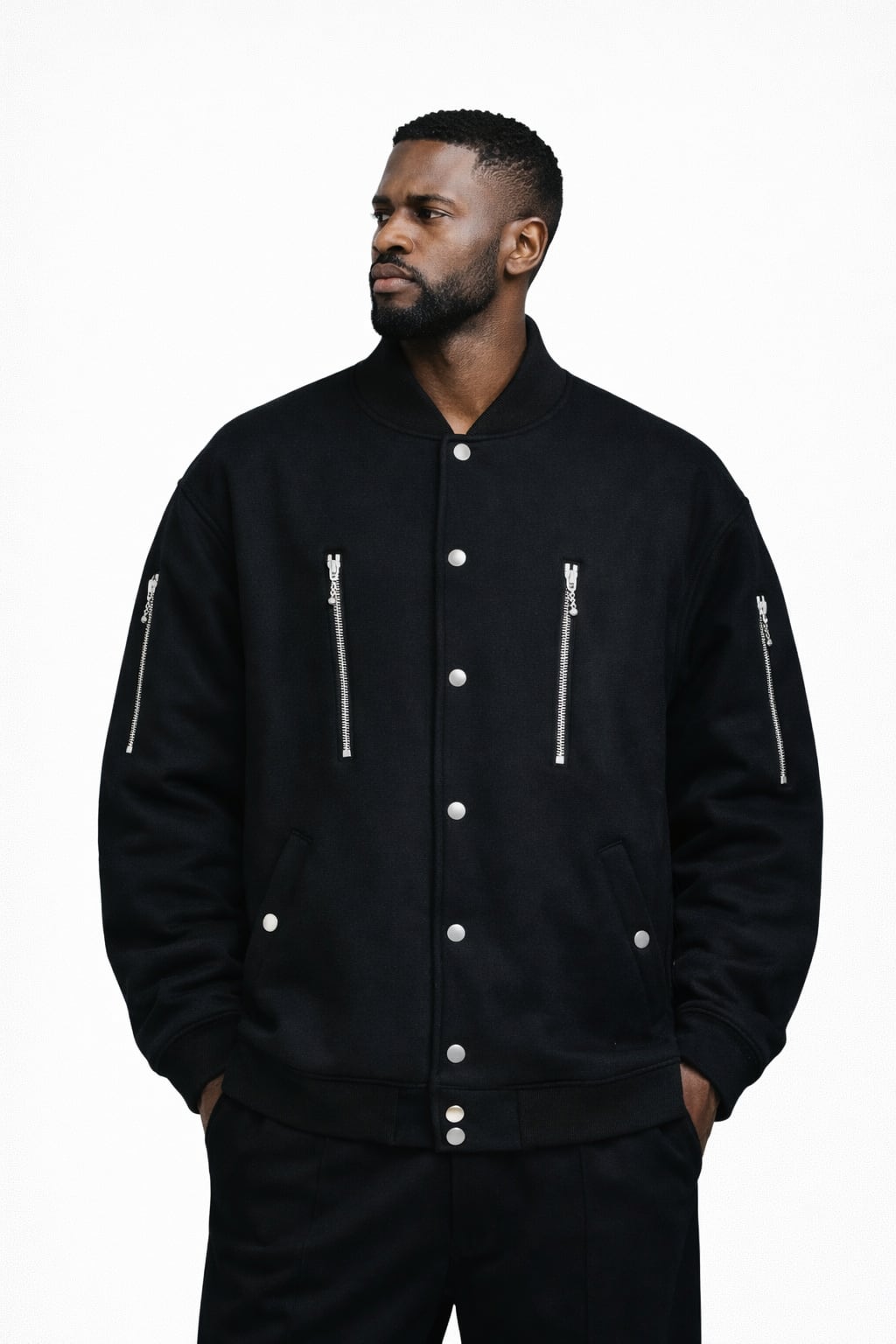 オールブラックのボディに、シルバーのジップのみで存在感を表現したスタジアムジャケット。